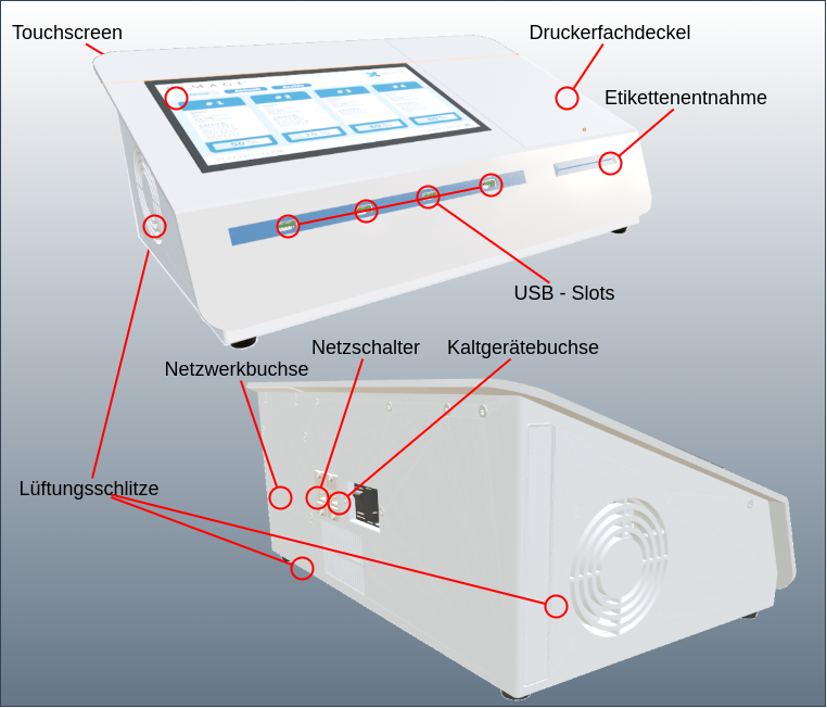 Die Bedienung ist grundsätzlich von ungeschultem Personal durchführbar. Zur Gewährleistung der Privatsphäre der betroffenen Patienten empfehlen wir den öffentlichen Zugriff oder Einblick auf das Gerät zu unterbinden.